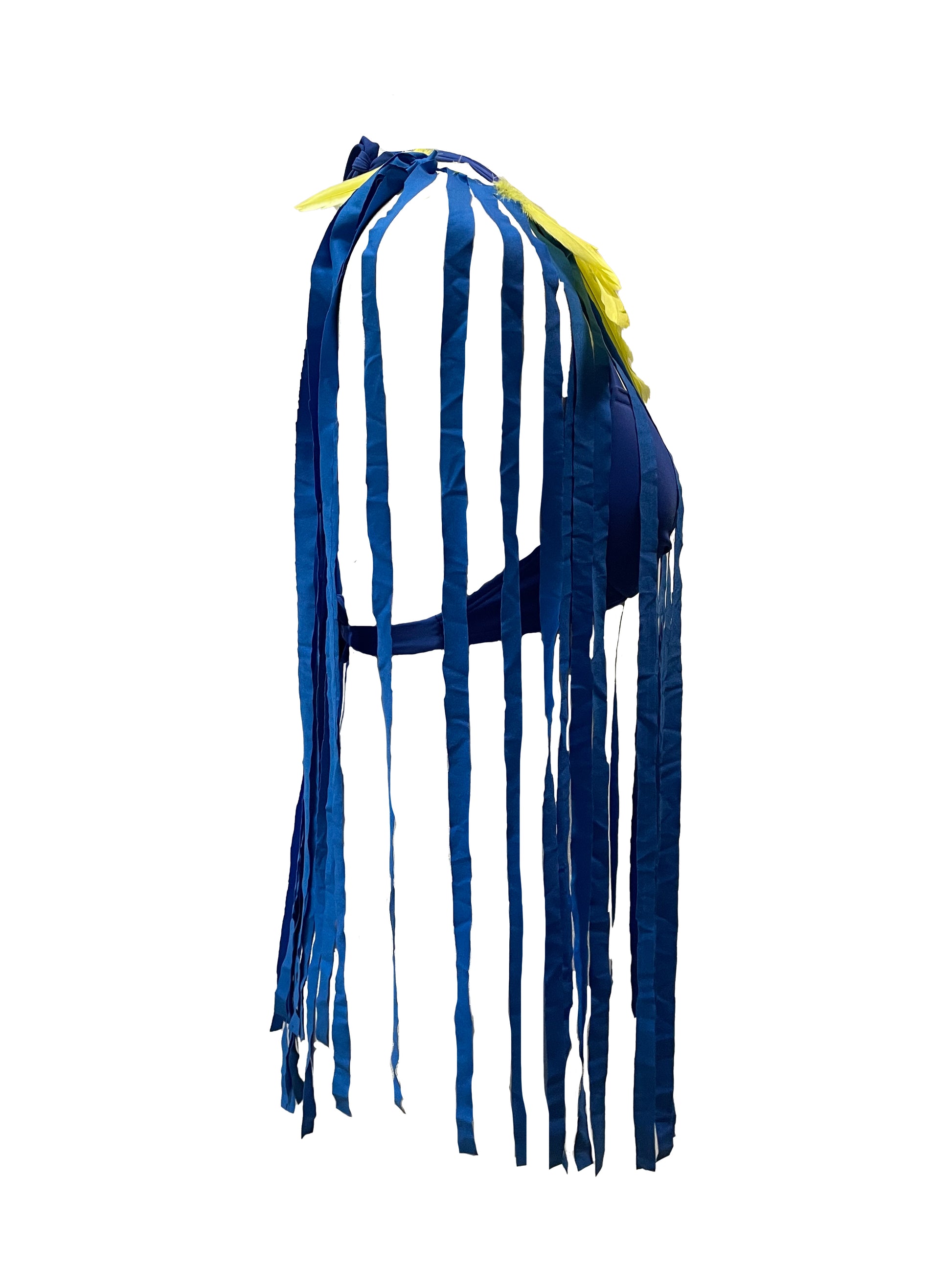 Get ready to turn heads with the Rio Fringe Top! Made with stretchy nylon material in a bright blue hue, this top is adorned with yellow feathers and handmade for a fun, festive touch. Perfect for beach cover-ups or statement event style, this top is sure to be your go-to for any celebration. (No pun intended, seriously).